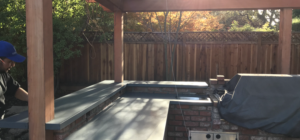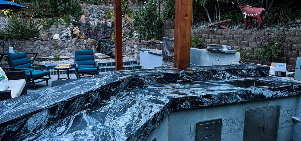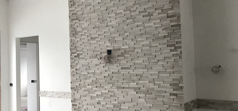 Quarts counter tops with full porcelain backsplash and hood wrap